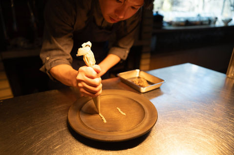 地元に戻って1年半ほど経ちますが、富士北麓地域で育った幼い頃の記憶を活かしながら、地元の文化を反映させた料理を作ることを特に意識するようになりました。東京では野草を採る機会もありませんでしたが、いまは自然の中での食材探しが楽しみの一つです。自分で採れるものは自分で採り、自分で育てられないものは専門家に任せる。そうしたスタンスで県内の農家さんとも積極的にお取り引きをしています。これからも料理を通じて山梨のテロワールの魅力を発信し続けたいと思っています。